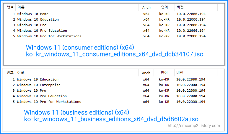 | ◑ 윈도우 11 21H2 MSDN 정식 버전 출시 ◐ 2021년 10월 05일 윈도우 11 MSDN 버전 출시 되었습니다 Windows 11 버전 21H2 (OS 빌드 22000.194) MS 에서 배포하는 순정 윈도우의 표준 입니다. MSDN 버전은 MSDN 구독자 (구독료를 내고 MS 소프트웨어를 무료로 사용)를 위해서 배포하는 ISO 파일입니다. -마이크로소프트 개발자 네트워크 MSDN (Microsoft Developer Network) https://en.wikipedia.org/wiki/Microsoft_Developer_Network OS 빌드 번호는 버전 21H2 (OS 빌드 22000.194) 입니다. MS 에서 공식적으로 배포하는 Windows 11 21H2의 ISO 파일입니다. •Windows 11 21H2 Build 22000.194 MSDN 출시일 : 2021년 10월 05일 OS : Windows 11 윈도우 : Windows 11 Version 21H2 (October 2021 Update) 전체 버전 : 10.0.22000.194 커널 버전 : 10.0 빌드 : 22000 빌드 리비전: 194 버전 : Version 21H2 코드네임 : co_release 정식 명칭 : Windows 11, version 21H2 (October2021 Update) 윈도우 11 버전 21H2 (2021년 10월 업데이트) ---------------------------------------------------------------------------------------------------------------- •Windows 11 OCtober 2021 Update MSDN •Windows 11 Consumer Editions 1 - Windows 11 Home 2 - Windows 11 Education 3 - Windows 11 Pro • 4 - Windows 11 Pro Education 5 - Windows 11 Pro for Workstations (리테일 버전 = 일반 소비자 버전) * Home 이나 Pro 선택하시면 됩니다. •Windows 11 Business Editions 1 - Windows 11 Education 2 - Windows 11 Enterprise • 3 - Windows 11 Pro 4 - Windows 11 Pro Education 5 - Windows 11 Pro for Workstations (볼륨 버전 = 기업용 버전) *Enterprise 선택하시면 됩니다. (윈도우 최상위 버전입니다) ---------------------------------------------------------------------------------------------------------------- •Windows 11 21H1 KO EN ISO •ko-kr_windows_11_consumer_editions_x64_dvd_dcb34107.iso 4.85GB •ko-kr_windows_11_business_editions_x64_dvd_d5d8602a.iso 4.79GB •en-us_windows_11_consumer_editions_x64_dvd_bd3cf8df.iso 5.12GB •en-us_windows_11_business_editions_x64_dvd_3a304c08.iso 5.0GB •Windows 11 21H2 KO EN SHA1 해시값 •ko-kr_windows_11_consumer_editions_x64_dvd_dcb34107.iso 4.85GB SHA-1: 70403289b4b77238bc4b31e930187d7416f3e6f2 •ko-kr_windows_11_business_editions_x64_dvd_d5d8602a.iso 4.79GB SHA-1: 1c85efb5a3575545baa53cbf91f387aee6627666 •en-us_windows_11_consumer_editions_x64_dvd_bd3cf8df.iso 5.12GB SHA-1: 849971ba1ddef294be2a79233edcf56b4e6991b0 •en-us_windows_11_business_editions_x64_dvd_3a304c08.iso 5.0GB SHA-1: 6d8f93d16a5db659c57ec50f6854e0b946af86ca •Windows 11 21H2 KO 제품명 •Windows 11 (consumer editions) (x64) - DVD (Korean) ko-kr_windows_11_consumer_editions_x64_dvd_dcb34107.iso 4.85GB SHA-1: 70403289b4b77238bc4b31e930187d7416f3e6f2 •Windows 11 (business editions) (x64) - DVD (Korean) ko-kr_windows_11_business_editions_x64_dvd_d5d8602a.iso 4.79GB SHA-1: 1c85efb5a3575545baa53cbf91f387aee6627666 •Windows 11 (consumer editions) (x64) - DVD (English) en-us_windows_11_consumer_editions_x64_dvd_bd3cf8df.iso 5.12GB SHA-1: 849971ba1ddef294be2a79233edcf56b4e6991b0 •Windows 11 (business editions) (x64) - DVD (English) en-us_windows_11_business_editions_x64_dvd_3a304c08.iso 5.0GB SHA-1: 6d8f93d16a5db659c57ec50f6854e0b946af86ca •FILE: ko-kr_windows_11_business_editions_x64_dvd_d5d8602a.iso SIZE: 4.79GB (5,153,824,768 bytes) CRC32: 23123673 MD5: 32FE428308E2C8ACAED37A7B28F31DCC SHA-1: 1C85EFB5A3575545BAA53CBF91F387AEE6627666 SHA-256: 162ED46B182D75B43021A11341CE18453C35DCF63A15C472810B83D543DA3607 •FILE: ko-kr_windows_11_consumer_editions_x64_dvd_dcb34107.iso = Win11_Korean_x64.iso SIZE: 4.85GB (5,218,525,184 bytes) CRC32: 39C3063B MD5: F92F516B08F1B2874CDE09E7588F52CC SHA-1: 70403289B4B77238BC4B31E930187D7416F3E6F2 SHA-256: D79FB9A622A1624A0C9EF09E440E614D288B0C93081792586A119389E62D95D7 •TechBench ISO = InsiderPreview ISO = MSDN ISO Win11_English_x64.iso = en-us_windows_11_consumer_editions_x64_dvd_bd3cf8df.iso Win11_Korean_x64.iso = ko-kr_windows_11_consumer_editions_x64_dvd_dcb34107.iso Windows11_InsiderPreview_Client_x64_en-us__22000.iso = en-us_windows_11_consumer_editions_x64_dvd_bd3cf8df.iso Windows11_InsiderPreview_Client_x64_ko-kr__22000.iso = ko-kr_windows_11_consumer_editions_x64_dvd_dcb34107.iso --------------------------------------------------------------------------------------------------------------- •Windows 11 consumer editions 윈도우 11 (소비자용 에디션) 1 - Windows 11 Home 2 - Windows 11 Education 3 - Windows 11 Pro 4 - Windows 11 Pro Education 5 - Windows 11 Pro for Workstations 이 소비자용(컨슈머) 에디션에는 다음 버전이 포함됩니다 •Windows 11 business editions 윈도우 11 (비즈니스용 에디션) 1 - Windows 11 Education 2 - Windows 11 Enterprise 3 - Windows 11 Pro 4 - Windows 11 Pro Education 5 - Windows 11 Pro for Workstations 이 비즈니스용 에디션에는 다음 버전이 포함됩니다 *1개의 에디션 안에 여러버전이 있어 선택해서 설치 하시면 됩니다 ---------------------------------------------------------------------------------------------------------------- •윈도우 11 소비자용 에디션 = Windows 11 Consumer Editions [리테일 버전=소비자 버전] • 일반사용자, 가정용 = Home • 초등학교, 중학교, 고등학교 교육기관 교직원 = Education • 중소기업, 자영업 = Pro • 대학교, 대학원 교육기관 = Pro Education • 방송, 통신, 정보 등 = Pro for Workstation •윈도우 11 비즈니스용 에디션 = Windows 11 Business Editions [볼륨 버전=기업용 버전] • 초등학교, 중학교, 고등학교 교육기관 교직원 = Education • 대기업, 엔터테언먼트 회사 = Enterprise • 중소기업, 밴처기업, 창업 = Pro • 대학교, 대학원 교육기관 = Pro Education • 방송, 통신, 정보 (비밀기관), 군 (비밀기관) = Pro for Workstation -----------