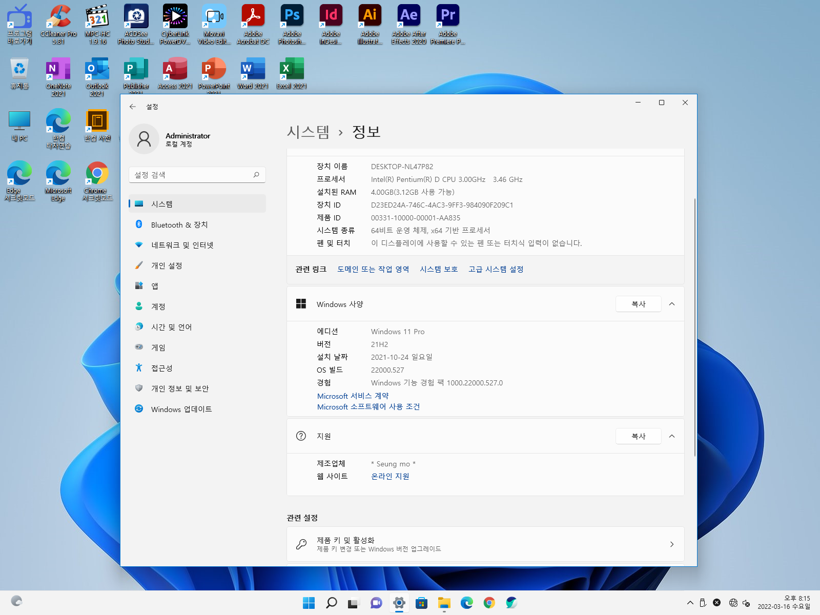 ♥ ↑Wondow 사양. 에디션 Windows 11 Pro. 버전 21H2. 최초 설치 날짜는 2021-10-24 일요일. OS 빌드 22000.527 입니다. 호환성을 높이기 위해 낮은 사양 컴퓨터에서 만능 윈도우 제작하고 있습니다. 이 컴퓨터는 10년이 넘은 사양인데요. 윈도우 11도 잘 설치가 됩니다. 프로그램도 잘 실행이 됩니다. 웹사이트 온라인 지원 클릭하면 제 블로그로 자동 링크 됩니다.