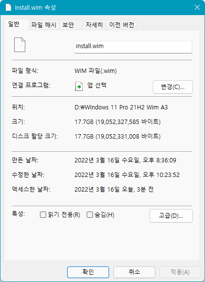 ♥ ↑install.wim 파일 용량입니다 17.7GB 입니다. 만든 날짜는 2022년 3월 16일 입니다