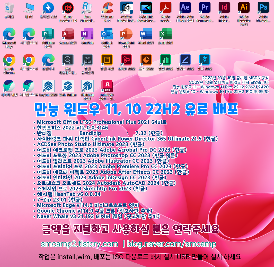 | * 7. 유료 배포 만능 윈도우 11 - Windows 11 Pro 23H2+Office 2021+한컴오피스 2024+ SketchUp 2023+Adobe Photoshop 2024+Adobe Illustrator2024 https://blog.naver.com/smcamp/223335008497 |
