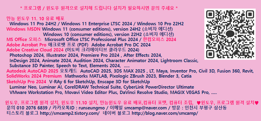 | * 6. 유료 배포 만능 윈도우 11-Windows 11 Pro 23H2+Office Professional Plus 2024+한컴오피스2024+ Adobe Photoshop 2024+Adobe Illustrator2024 https://blog.naver.com/smcamp/223334993046 |