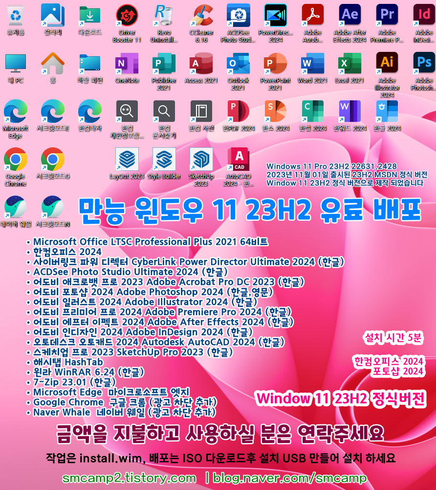| * 7. 유료 배포 만능 윈도우 11 - Windows 11 Pro 23H2+Office 2021+한컴오피스 2024+ SketchUp 2023+Adobe Photoshop 2024+Adobe Illustrator2024 https://blog.naver.com/smcamp/223335008497 |