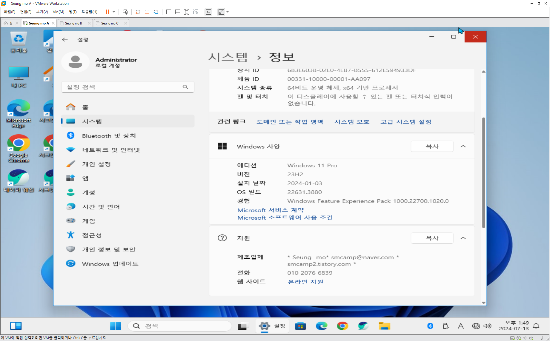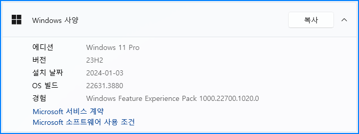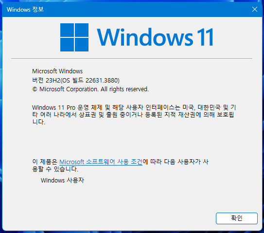 Windows 11 Pro 23H2 22631.3880 버전 빌드 23H2(OS 빌드 22631.3880)