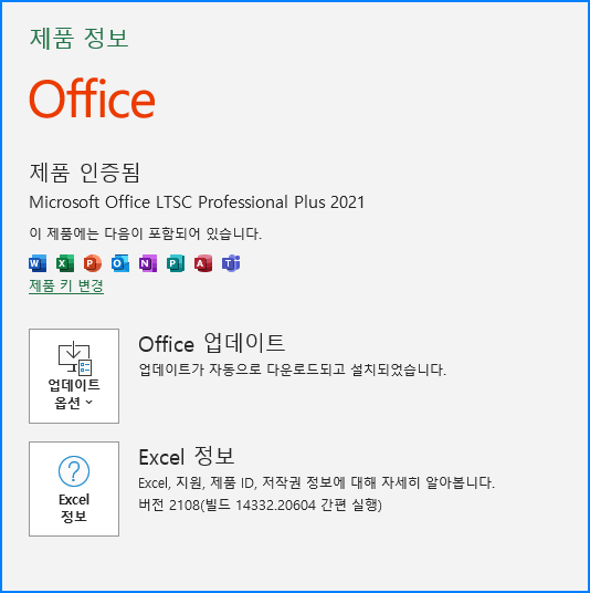 -오피스 버전 2108 (빌드 14332.20582) / Excel 2108 v16.0.14332.20579 64비트